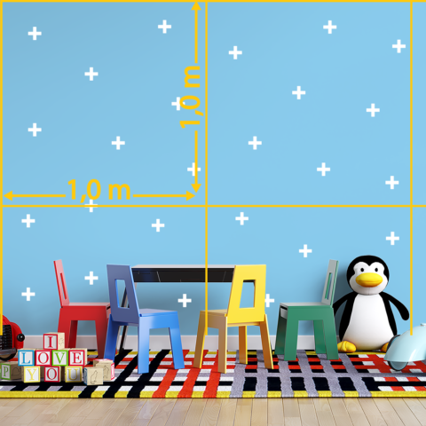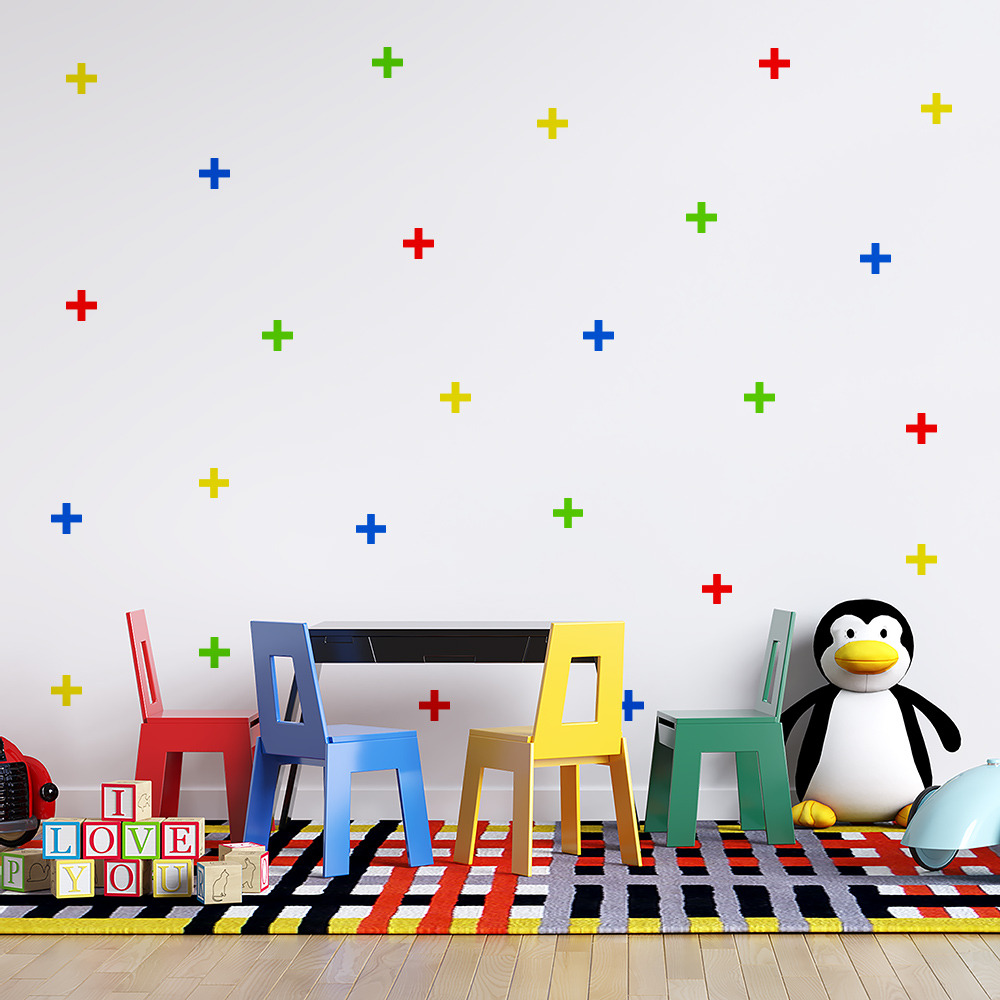 O adesivo de parede em formato Cruz está disponível em 7 opções de cores: branco, azul, rosa, combinação de rosa claro e escuro, preto, amarelo e multicores.