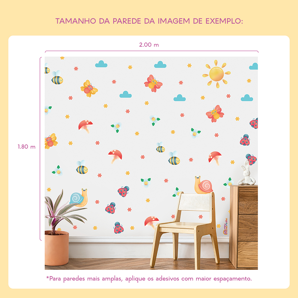 A sua parede vai ficar linda. Enviaremos junto com o seu adesivo de parede um guia completo com instruções detalhadas e sugestões de aplicação, para que você distribua os adesivos de forma harmoniosa e crie um espaço lúdico, perfeito para crianças.