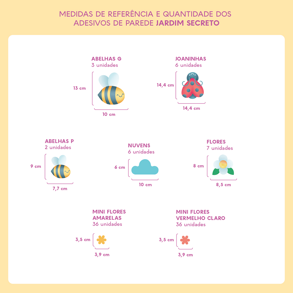 Os tamanhos de cada adesivo que compõem o tema estão disponíveis nas fotos dos produtos. Caso sua parede seja muito grande, recomendamos adquirir duas unidades para garantir uma decoração perfeita.