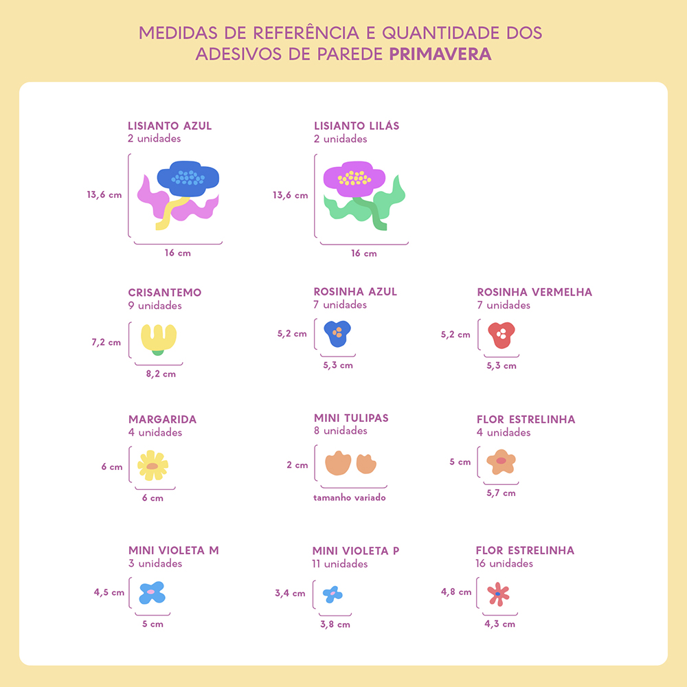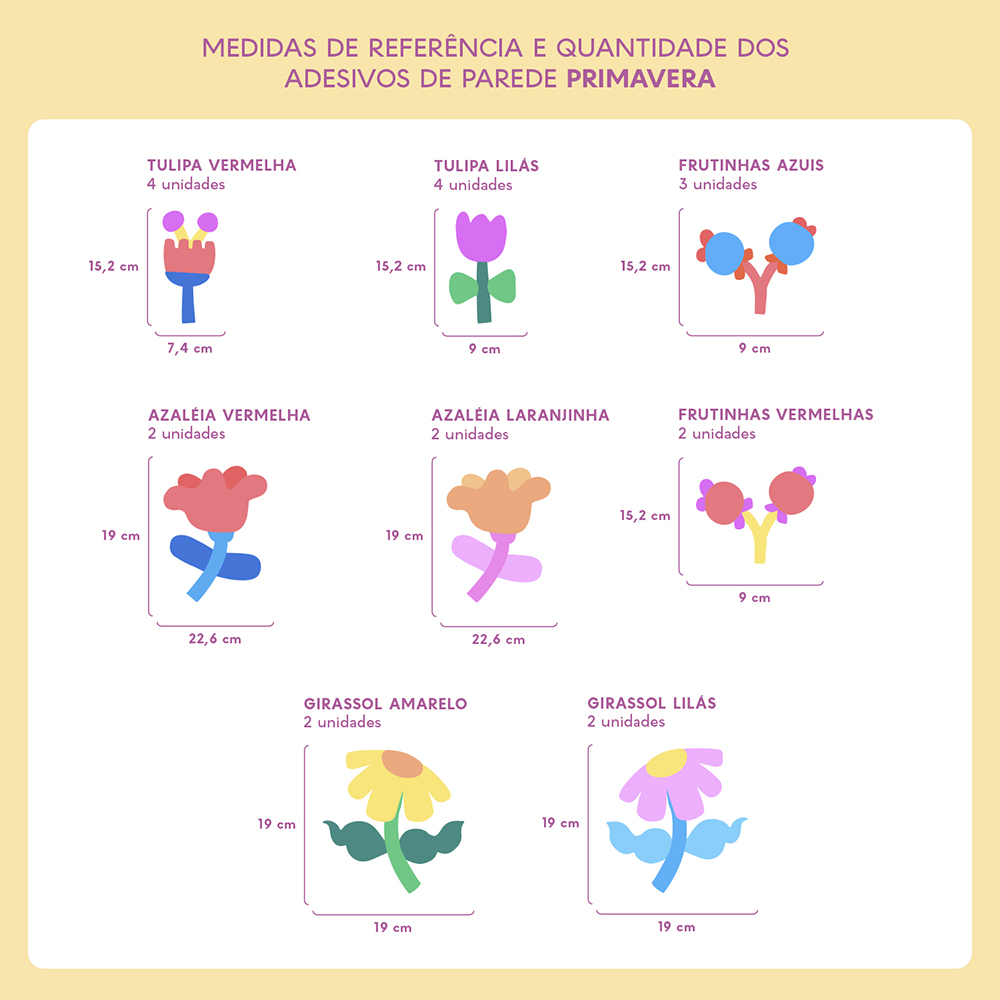 Os tamanhos de cada adesivo que compõem o tema estão disponíveis nas fotos dos produtos. Caso sua parede seja muito grande, recomendamos adquirir duas unidades para garantir uma decoração perfeita.